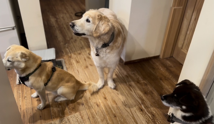 昨晩の夕食を待つフラッシュ、シン、スズです。食欲があり元気に過ごせる時間を大切にしたいと思っています。