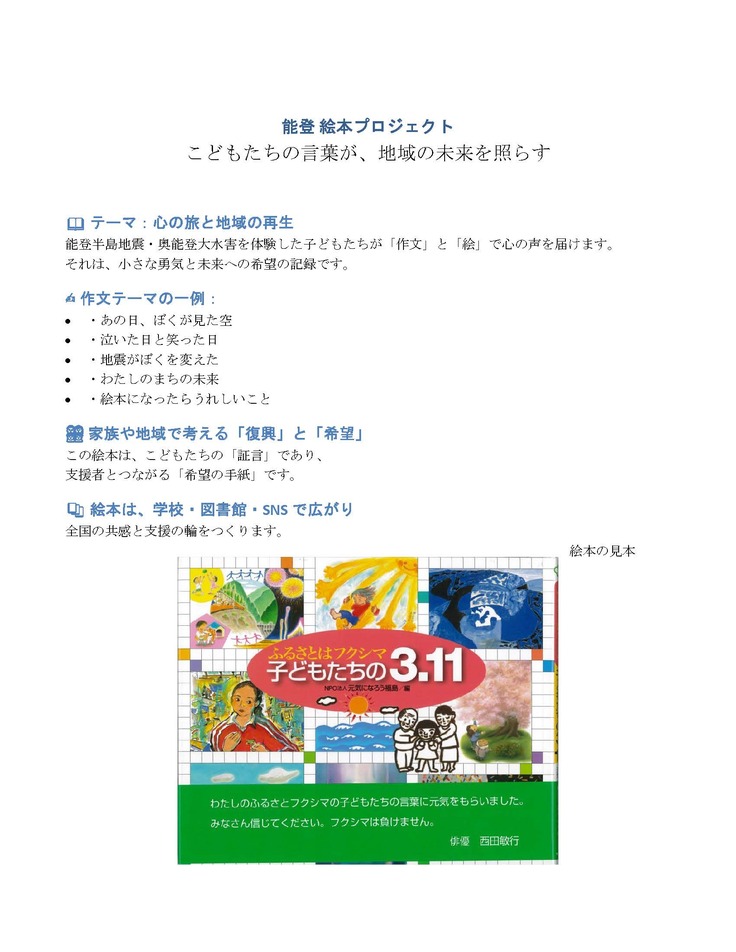 以前の「ふるさとはフクシマ子どもたちの3.11」の編集事業に携わっていたこそ、今回の「能登半島地震+奥能登大水害」の「絵本プロジェクト」が更に大きくなりました。