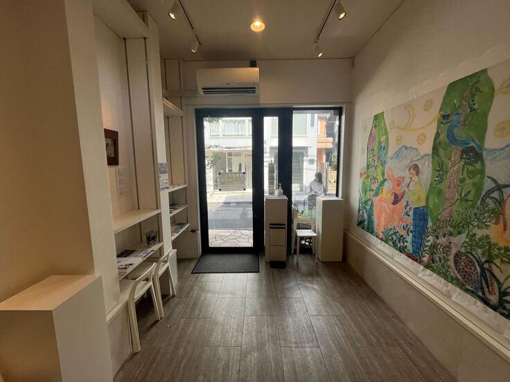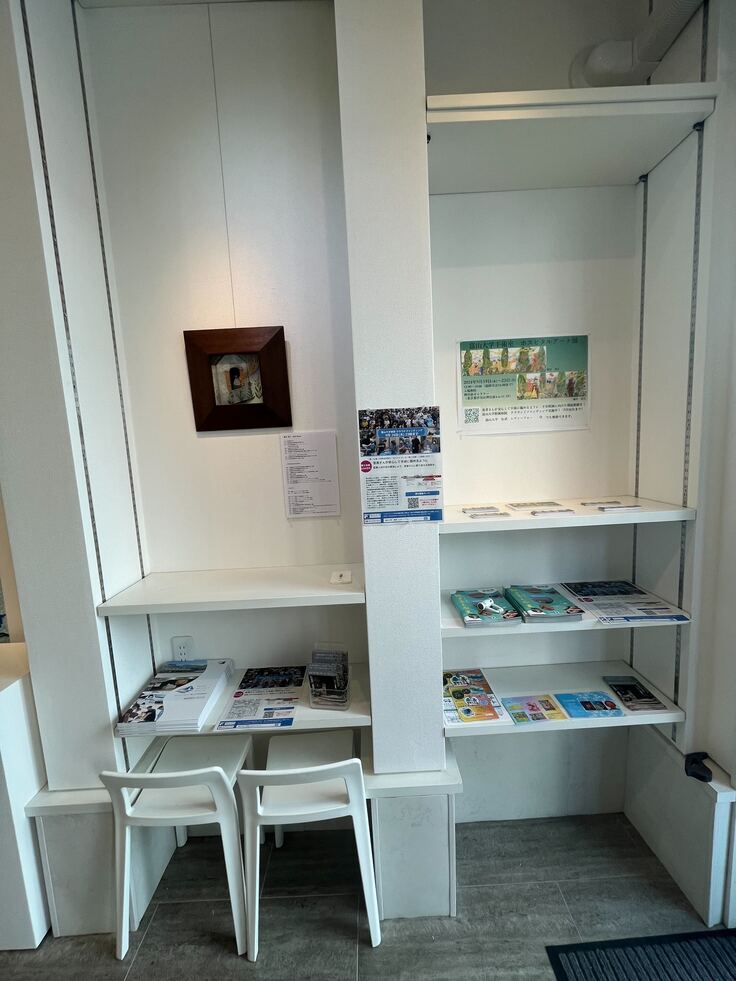 こちらには作家細井茶生(さき)さんの素敵な作品、経歴がご紹介されています。その他、富山大学クラウドファンディングのチラシ、DMハガキ、シール、富山大学附属病院の診療案内2024、富山県の観光案内、神宮前ギャラリーのイベント紹介などが置かれています。お手に取ってご覧ください(お持ち帰りいただけます)。