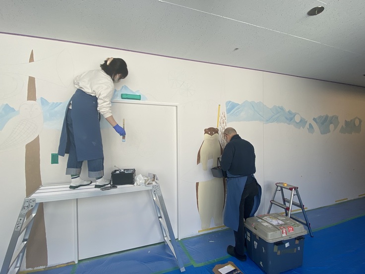 左手は、画家さんが脚立に登って美しい立山連峰、そして木々を描いてくださっています。動物たちも! 右手の画家さんが描いているのは、オコジョでしょうか。背が高くて目がまん丸で、とてもかわいいです。なんだかいい雰囲気になりそうです。