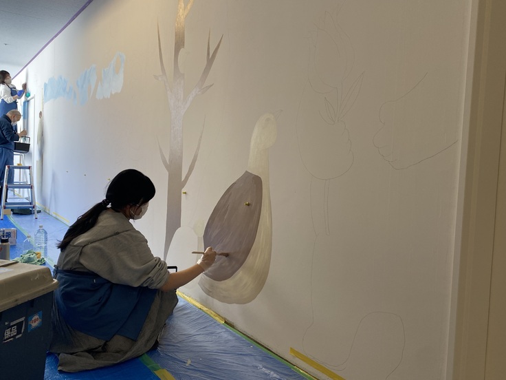 みなさん こんばんは! プロジェクトリーダーの佐武利彦です。遂に絵画作成がスタートしました。壁面に4名の画家さんが等間隔に並び、それぞれに描いてくださっています。前日には、ペンシルで壁に下書きがされて、3月14日からは本格的に絵具が入っています。やさしい色合いです。