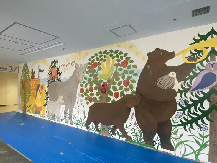 朝、手術室に入り、夕方、出てきた時も丁寧に作業してくださっていました。本当に長い間、ありがとうございました。お疲れさまでした。手術室前の壁面には、富山の雄大な立山を背景に、動物や植物などが描かれています。動物たちはとても楽しそうな表情で歌声が響いてきそうです。手術室前はとても良い雰囲気になりそうです。附属病院にてこのアートが末永く愛され、患者さん、医療スタッフにとっても癒しの場になることを願っています。