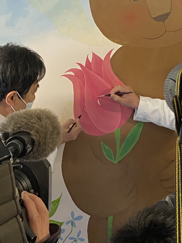 みなさん、こんばんは。手術室前のホスピタルアートが遂に完成しました。そして完成記念式典が13時30分から開催されました。病院長林 篤志先生とプロジェクトリーダーの佐武利彦と二人で、チューリップの花びらにピンクの一筆を入れて、完成しました!ファンファーレが鳴り響きました。とても緊張して、一筆を入れる自分の手が震えていました。