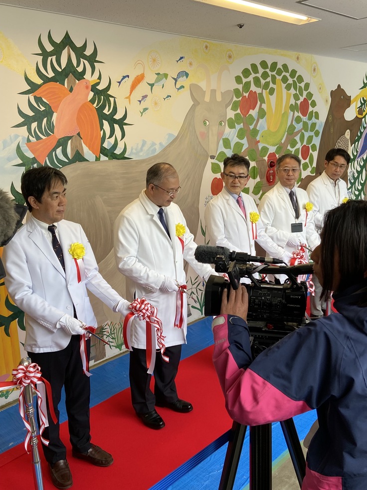 そして完成後は、レッドカーペットの上に一列に並び、テープカットを行いました。これもはじめての経験でした。テレビ報道関係の方に、たくさん来てくださって取材を受けました。病院長林先生、アーティストの細井茶生さん、そしてわたしに、順にインタビューしていただきました。 ありがとうございました。
