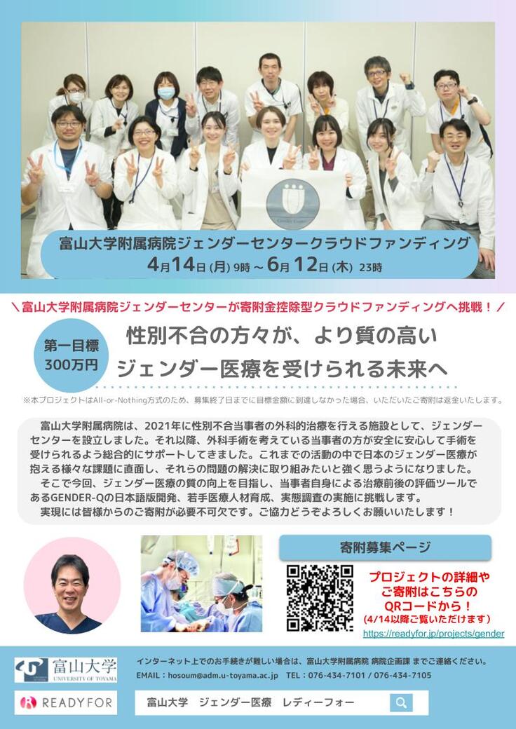今回は私がセンター長を務める、富山大学附属病院ジェンダーセンターを中心に、学生や所属する医師が一体となってクラウドファンディングへ挑戦いたします。