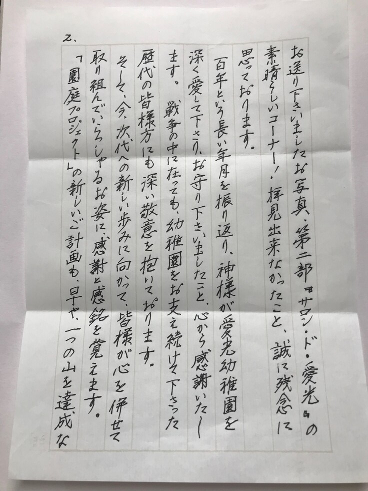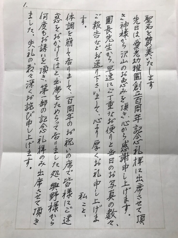 先日は、100周年記念礼拝に出席してくださった98歳の卒園生からお手紙をいただきました。