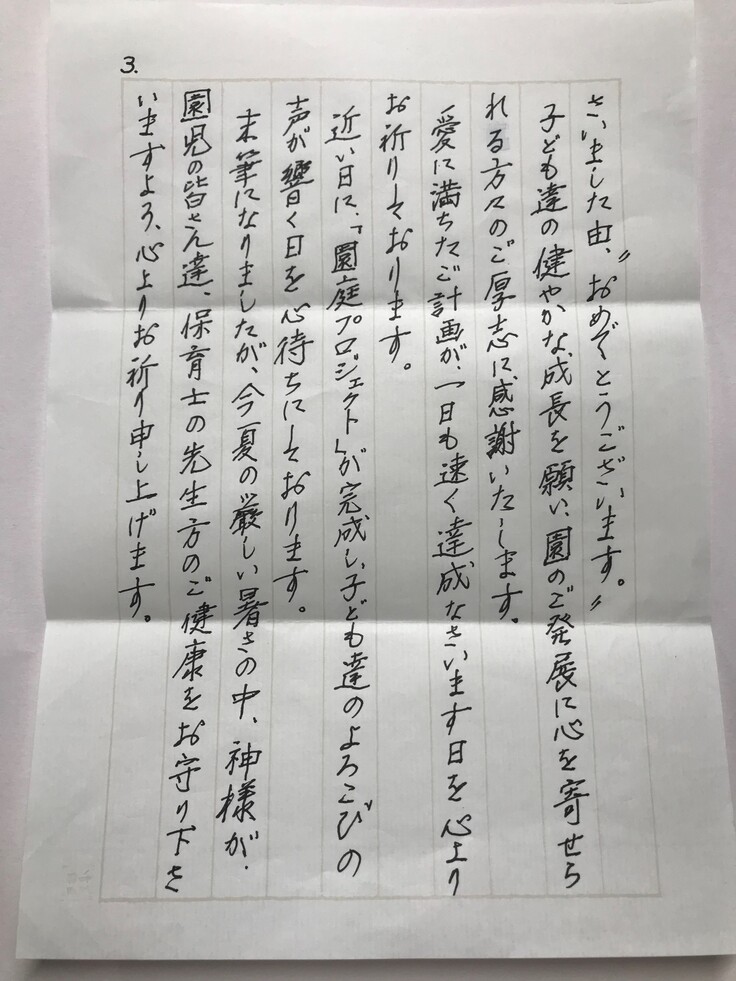 6月29日に執り行った記念行事の時に参加してくださった方や寄附をクラウドファンディングで挑戦する中で園に応援の声が届けられています。感謝です。