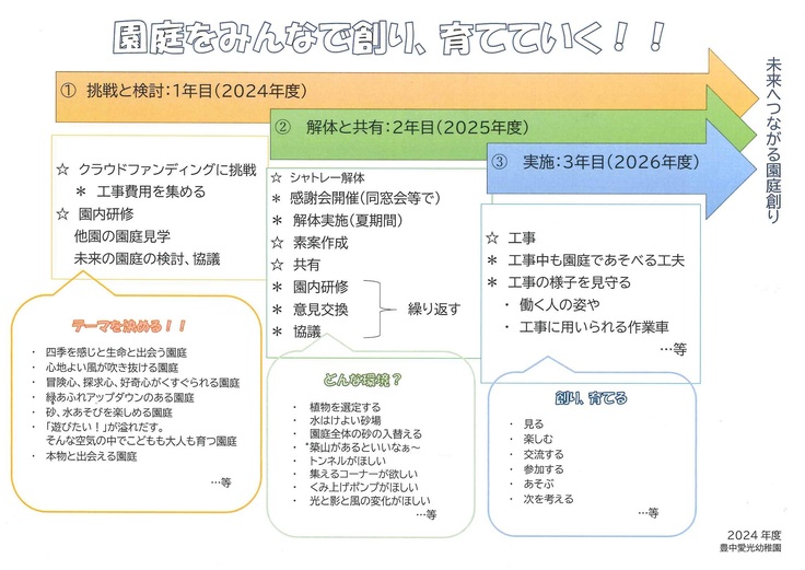 クラウドファンデイングへの挑戦からスタートして、ゆっくりと時間をかけてよりよい園庭環境を創って次の100年につなげていこうと思います。