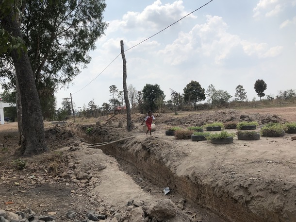 雨季になると溢れ出す雨水を池に貯水するために校庭とグランドの脇に100メートルの排水溝を設置しました。排水口には2ヶ所橋を設置してあります。今回は掘削までとなりましたが今後側面を削り根の強い植物で補強を行う予定です。