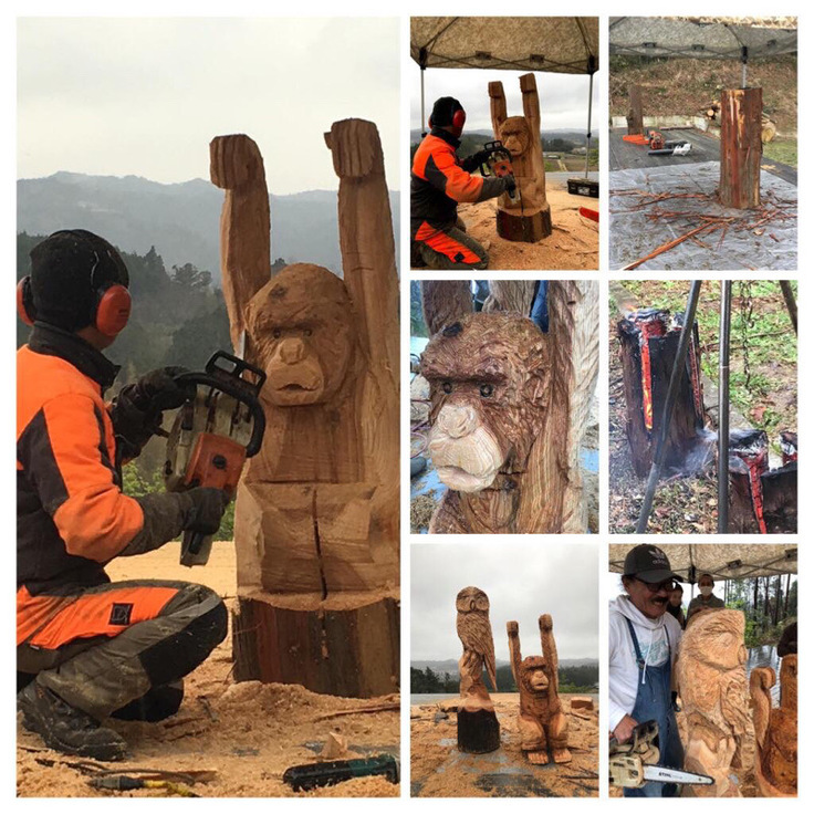 チエンソーカービングでのチンパンジーとフクロウも完成