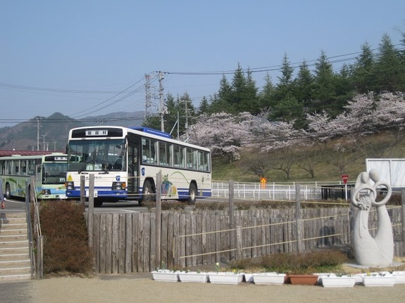 小学生が通学に使うバスと「までい」な像。もう一つは、飯舘村にある放射線量の測定機械です。