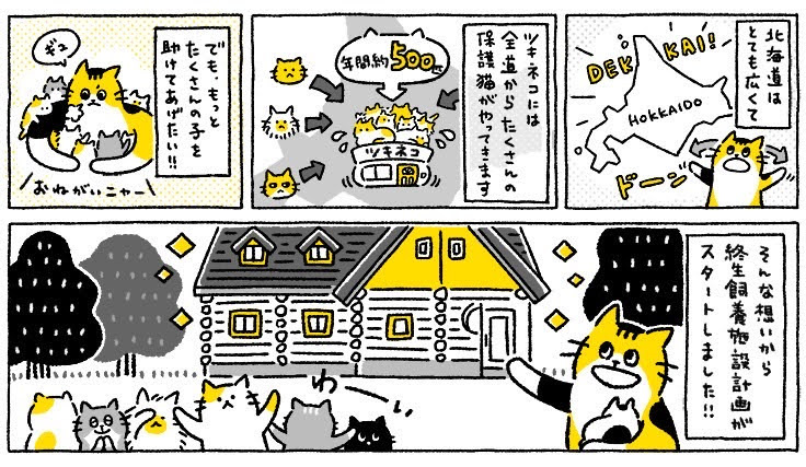 ツキネコ北海道のチームワークは素晴らしく今回のプロジェクトのお話を聞き、絶対に成功させてくれると確信しております。 終生飼養施設は様々な事情により飼育放棄された高齢猫や譲渡が難しい病気を抱えた猫や人に懐かない猫たちの最期まで安心して過ごす為に必要な住処です。