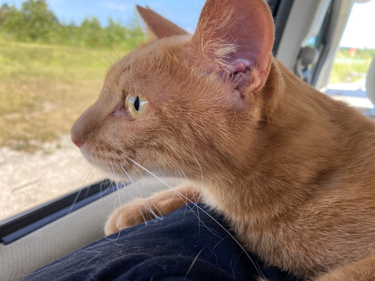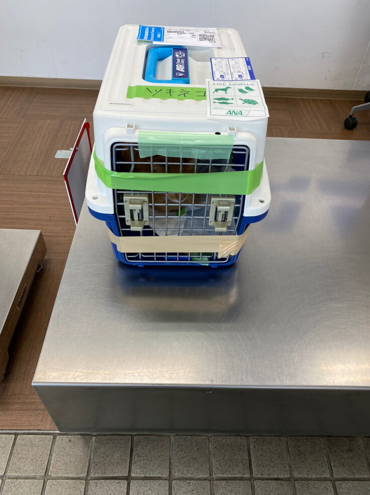 道中、ハッピーは何か不安を感じていたのかにゃーにゃーと鳴き続けていましたが、空港に入る前に代表がよしよしと抱っこしてあげたら、落ち着いて鳴き止みました。流石です。