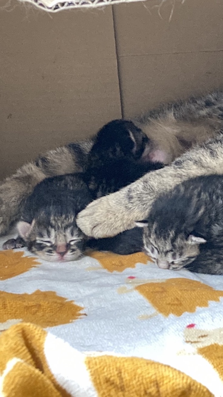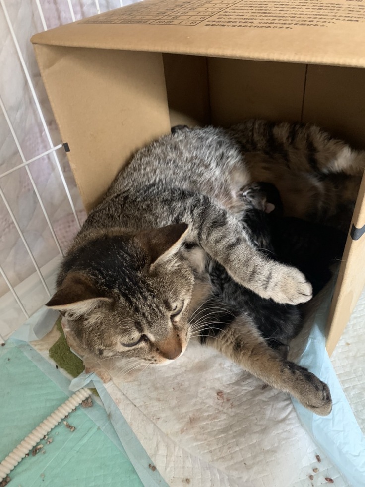 」「えもんかけ」5匹家族みんな一時預かりボランティアさんのおうちで、落ち着いて子育て中です。