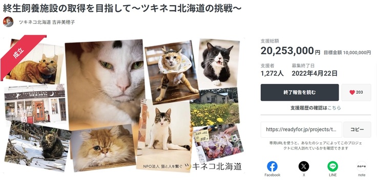 2022年2月22日からスタートしたクラウドファンディングプロジェクト【終生飼養施設の取得を目指して〜ツキネコ北海道の挑戦〜】 では不可能と思われた2,000万円という大きな目標を皆様のご協力の元達成することができました!