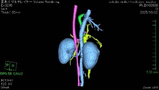 上の画像は、実際のムクのCT画像です。黄色い血管が門脈、異常なシャント血管は緑色の部分です。