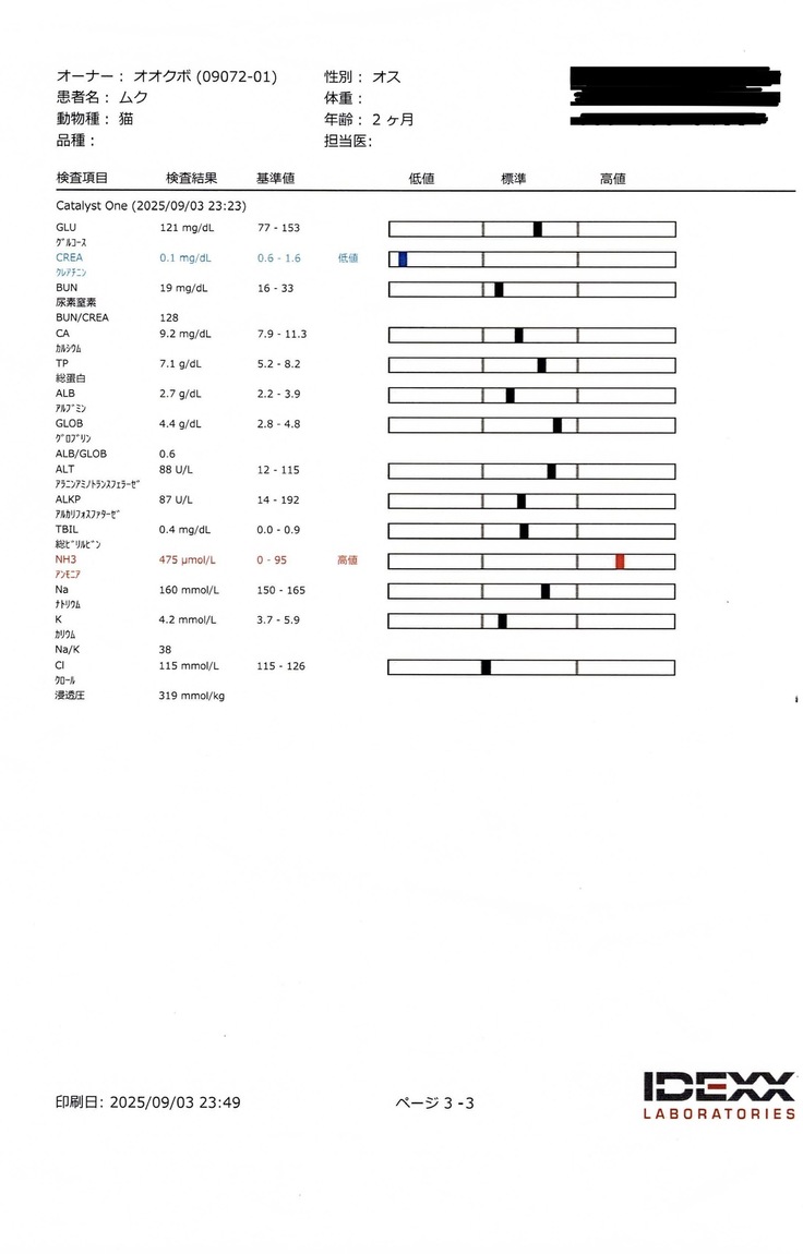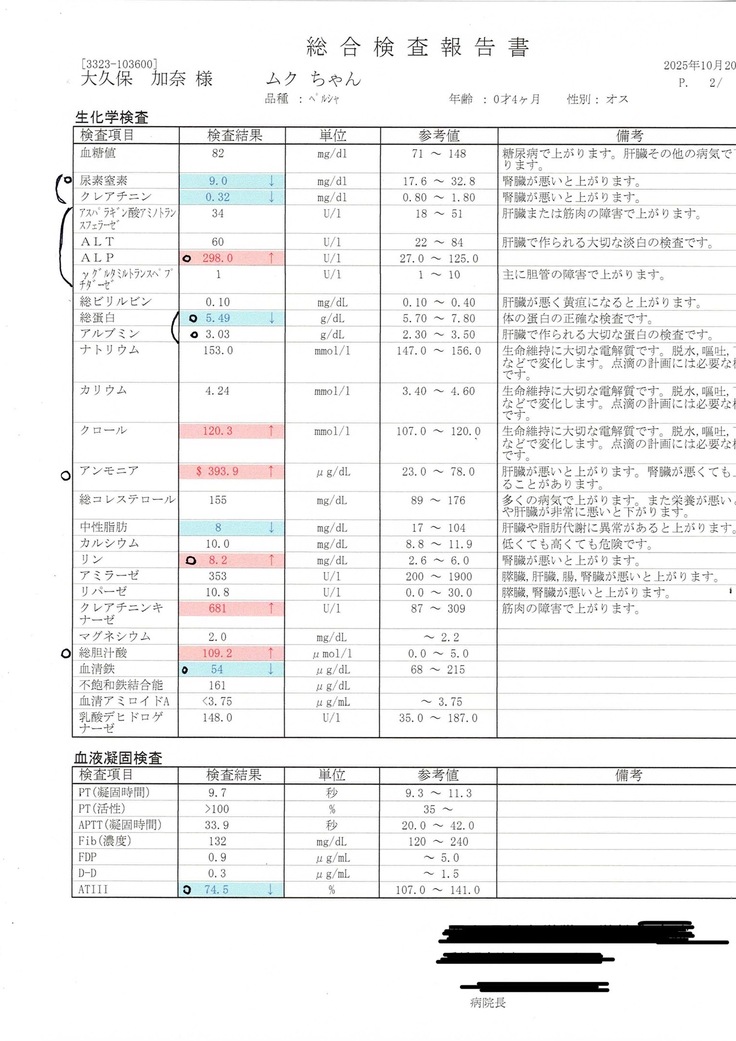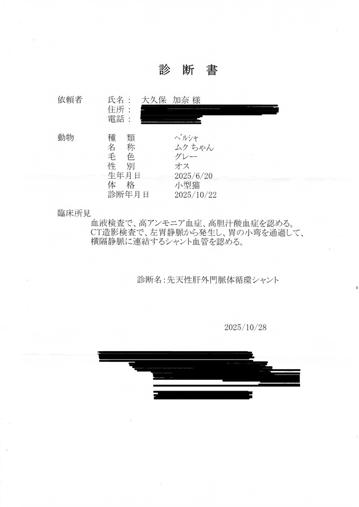 血液検査の結果、アンモニア値が400を超えており、肝臓の数値も悪く「門脈シャントの疑いがある」と医師に告げられました。