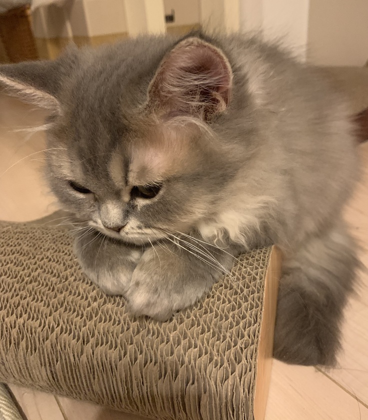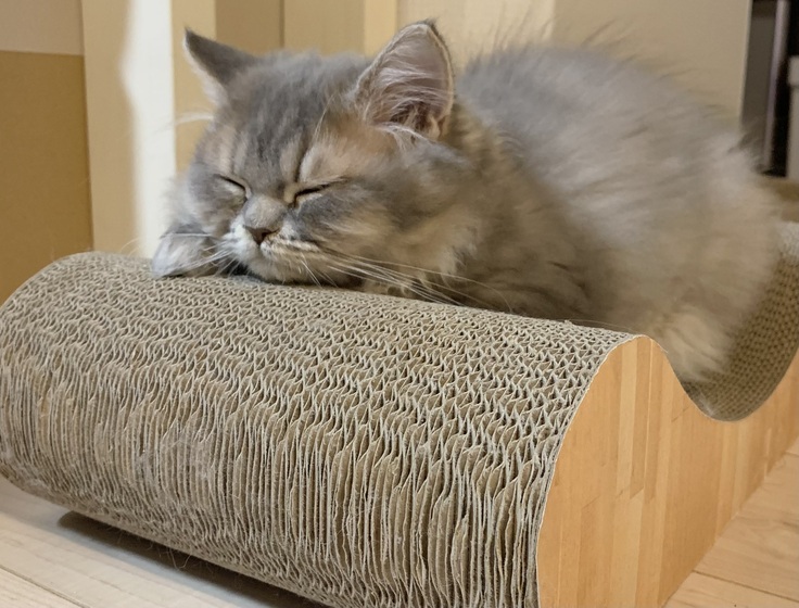 お気に入りの爪研ぎの上で丸くなって寝ています。