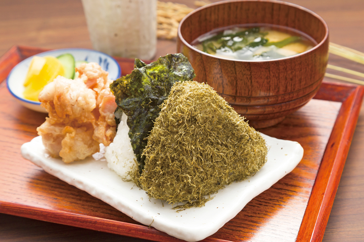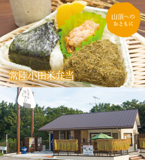 おむすび2個・唐揚げ・味噌汁付きの常陸小田米セット、帰りのお土産用に三角パックにはいったあられが人気です。
