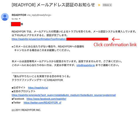③ Check your email inbox and click through to Readyfor to confirm your registration