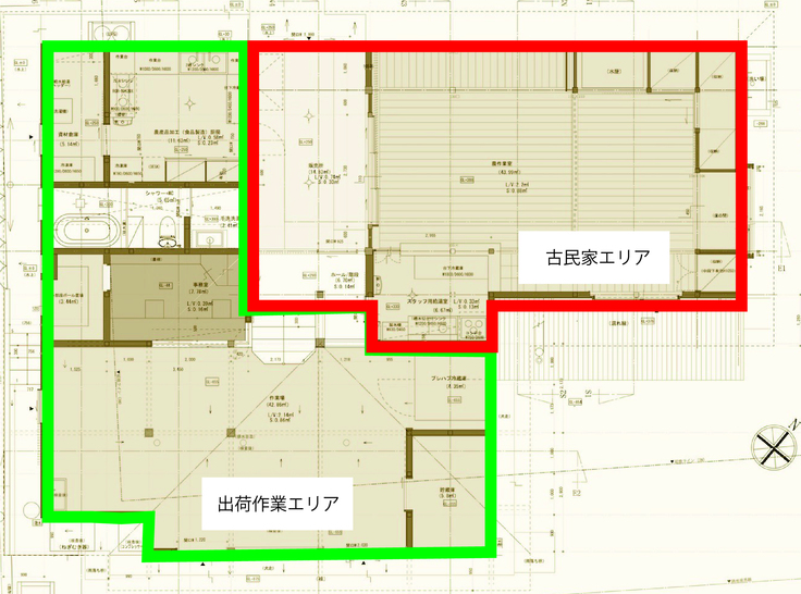 それが、農作業に必要な冷蔵庫や貯蔵庫、事務所などのある機能的な出荷作業エリアと、農業体験や直売所など外から人が訪れることのできる開放的な古民家エリアのふたつにエリア分けされたプランだったのです。
