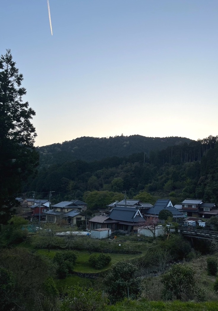 ある夕暮れ時の野庵。飛行機雲が輝いて、まるで流星のように見えました。