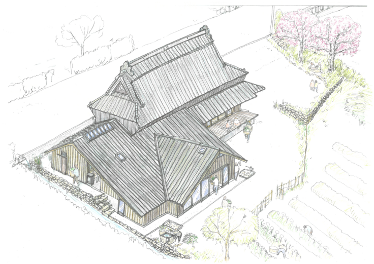 古民家エリアには、農作業体験スペースと、直売所、農産加工所の機能があります。古民家らしい意匠を残し、今ある古い柱や天井を綺麗に磨いて甦らせるプランになっています。なかでも、天井裏に残っていた煤(すす)竹は、一度外したのちに洗って張り直します。(こちらは予算の都合上、私たち自身でやる予定です)玄関土間も復活させ、かつての茅葺の暮らしを感じることのできる造りとなります。