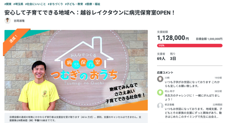 残り3日、プロジェクト終了までに、病児保育室の年会員50名を目指します。