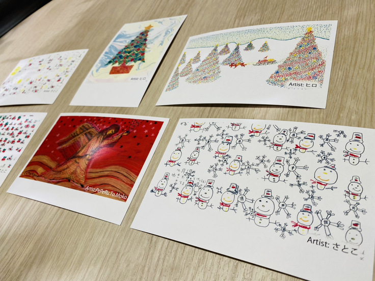 今回、福岡県久留米市にある「アトリエ型就労支援事業所 studio nucca」様とコラボして、発達に心配のある・知的障がい等を持つ子どもたちが描いた冬らしい絵で年末挨拶用の絵葉書を制作させて頂きました。