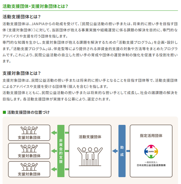 そんな中、ちょうど当財団が行っている中間伴走支援に対する助成制度が新たに作られるようです。日本民間公益活動連携機構(JANPIA)通常、ジャンピアが銀行の休眠預金を財源とする組織から今年7月から中間支援を行う活動支援団体を公募を行うようです。