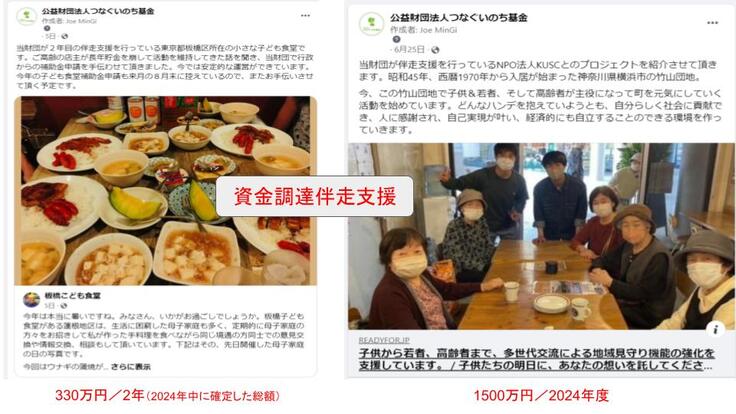 実際に、昨年の2024年には非金銭の伴走支援として上記2団体に対して合計1,830万円の運営資金の調達の他、食材や食料品、中古のランドセルなどの現物の寄贈まで集めることができました。この資金調達の支援により、子ども・若者の支援事業が拡大でき、多世代を巻き込んだ地域の支援事業に進化することもありました。