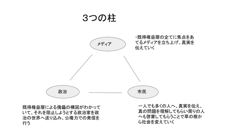 私は、この利権を本質とする、既得権益層による管制経済体制を打破したいと考え、3つの柱を軸として社会へ働きかけることで、この日本社会を変えたていきたいと考えております。