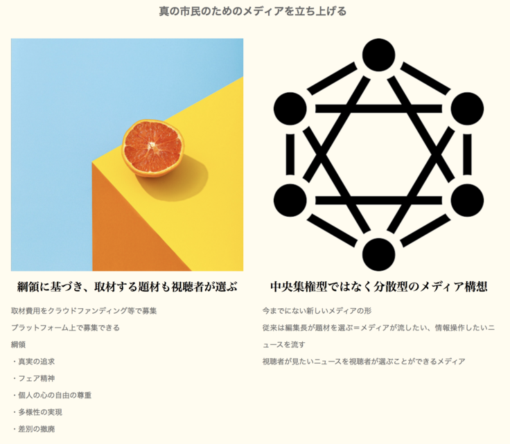 そして、これらの綱領を追求することによって、人にやさしい社会の実現を目指して、このプロジェクトを成功させ、民主主義を守る基盤として、市民のための草の根メディアを、忖度しない、真実を追求するメディア文化を日本に根付かせたいと考えています。