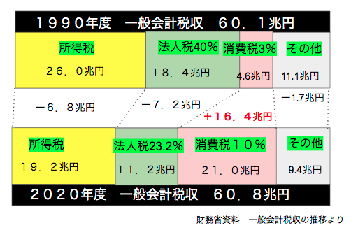 ではこの間の30年間、消費税が上がった分、税収は増えているのでしょうか。