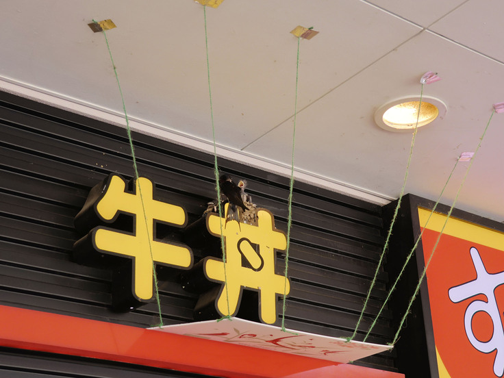 こちらは東京の八王子市にある牛丼チェーンすき家で子育てしたツバメです。ここでも、通行人にフンが当たらないようにするフン受けに加えて、ヒナを守るためにカラス避けのひも張りをしています。20cmくらいの間隔でひもを張るだけで、カラスは巣を襲うことができなくなります。なお、フン受けの設置やひも張りは、親ツバメが抱卵を始めてから行いましょう。卵を産むまでは、ツバメは異常を感じると巣を放棄してしまうことがありるので注意して下さい。