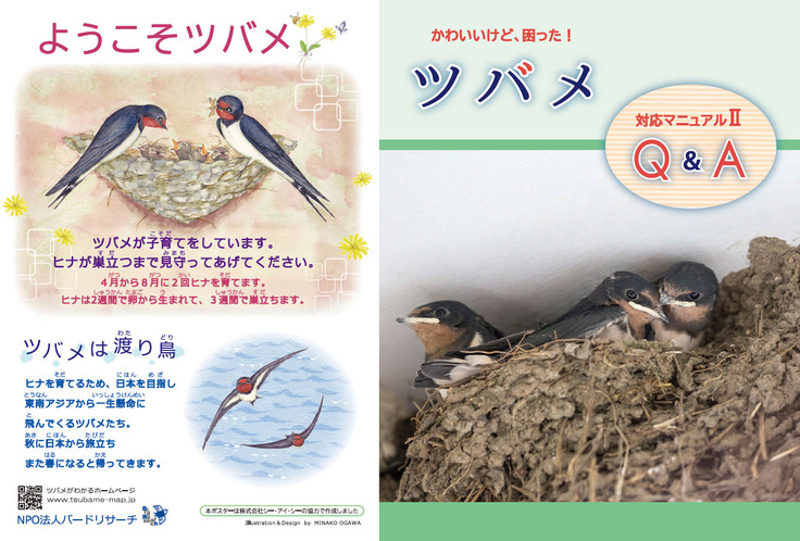 ツバメとの共生をお願いするポスターを新しいデザインで作成し、Q&Aパンフレットはカラス避けのひも張り方法を書き加えた改訂版を作りました。イラストはフン受けと同じ小川美奈子さんがボランティアで制作してくださいました。ツバメ観察全国ネットワークのホームページからもPDFをダウンロードできます。