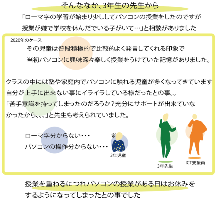その児童の言うように毎年似たような内容で苦戦する児童はいました。急遽早まったICT機器の授業、本来であれば段階的に学習が進められる予定でしたコロナの影響で5年の猶予をすっ飛ばし現場では各学校模索中です。どうにか今までやって来れていましたが、これから主軸になるICT活用の授業を児童や先生のために改善しなければいけない