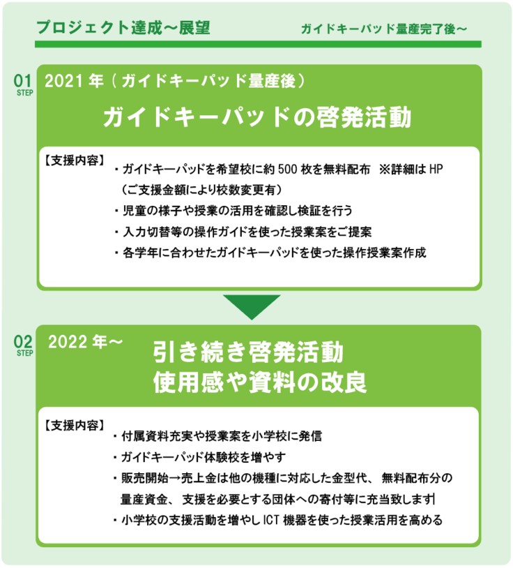 ①このガイドキーパッドを使いたい!と考える小学校をHPにて募集を募ります枚数が許す限り無料で配布します。