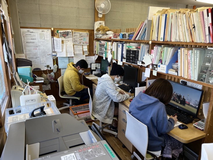 12か所の拠点を統括する法人本部は20年前に、賃貸物件を借りた折に「聴覚・ろう重複センター碧」の一角に、椅子を三脚、パソコンを3台並べられるスペースを作り、以来ずっとその場所で事務を行ってきました。