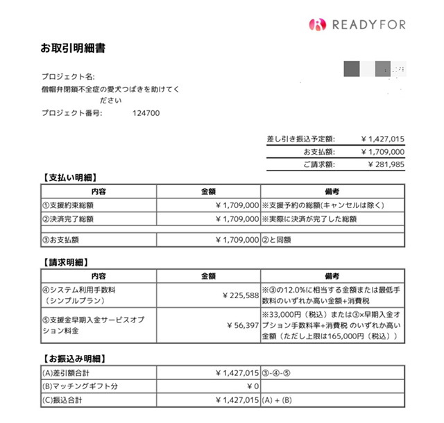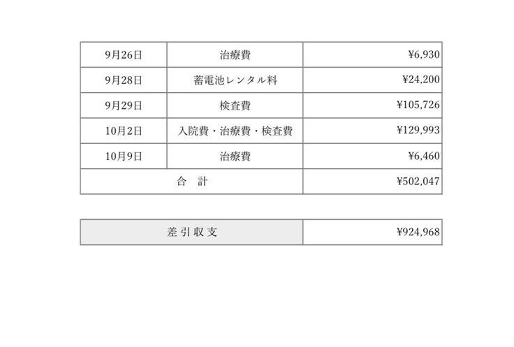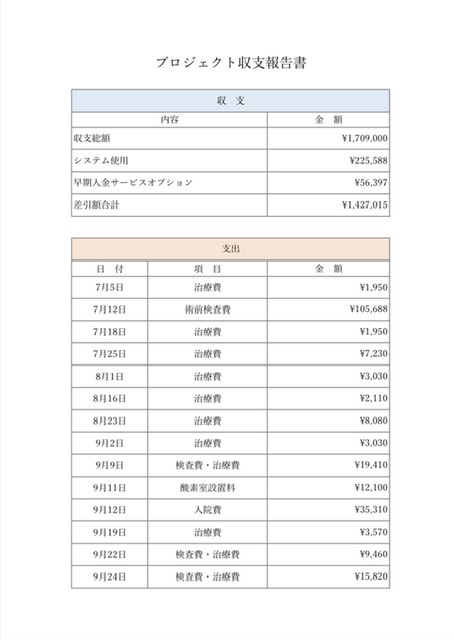 プロジェクト達成によりいただいた支援金の詳細とこれまでの治療費の詳細です。