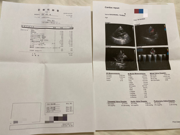 再度一通り検査をしていただいた結果は、今までの肝臓の太くなっていた血管が細く改善され、左右の心臓も利尿剤の効果が良く効いたようでかなり小さくなっているようです。