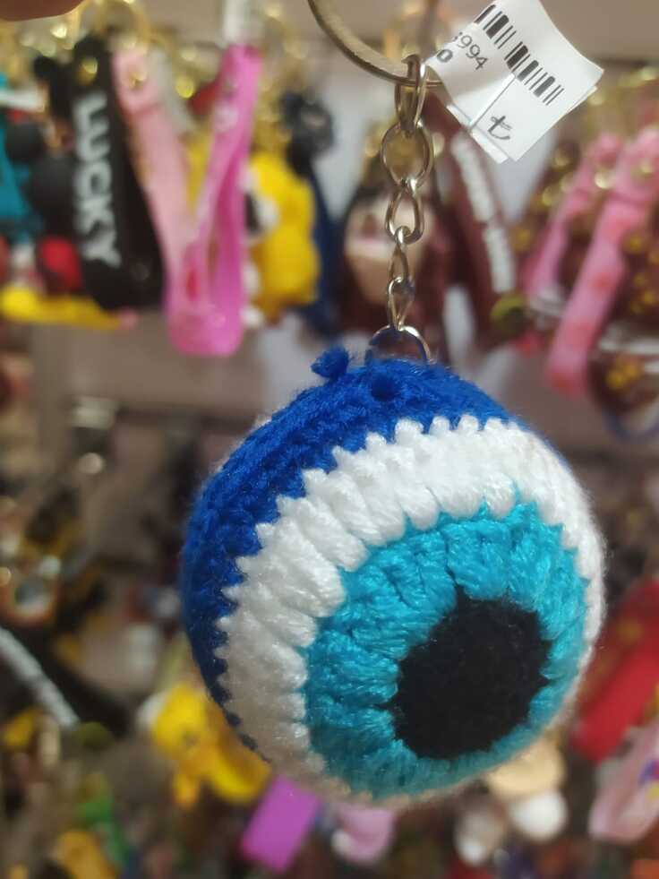2、トルコ名産「ナザールボンジュウ(目玉のようなデザインのお守り)」:ふわもこキーホルダー/ブレスレット