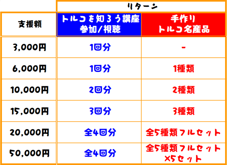 そこでネクストゴールでは、もっと多くの方に、もっと気軽に支援して頂くために、最大限に運営経費を省いた、「2000円でトルコ名産品をお届けするコース」を新設し、「もっと多くの人がトルコに興味を持ち、関わり、持続的な活動に繋げてほしい」という思いから、100人の参加を目標といたします。(Readyforシステム上は金額設定しかできないため目標額15万円としました)