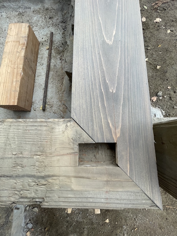 さて、工事現場の様子ですが、今日は御本殿(神様のお部屋)の足回りで古くなった木材を新材に取り替えてましたが、新材の肌色っぽい木の色を、既存の建物と見た目を合わせるためあえて、古材の色(グレー?)を塗装する古色仕上げについて紹介します。