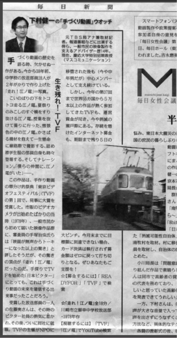 市民映像の貴重さや面白さを、様々な角度から紹介し、毎月楽しみにされている読者も多いと思いますが、3月27日(金)付けの紙面で『生き残れ!TVF』と題する記事が掲載されました。