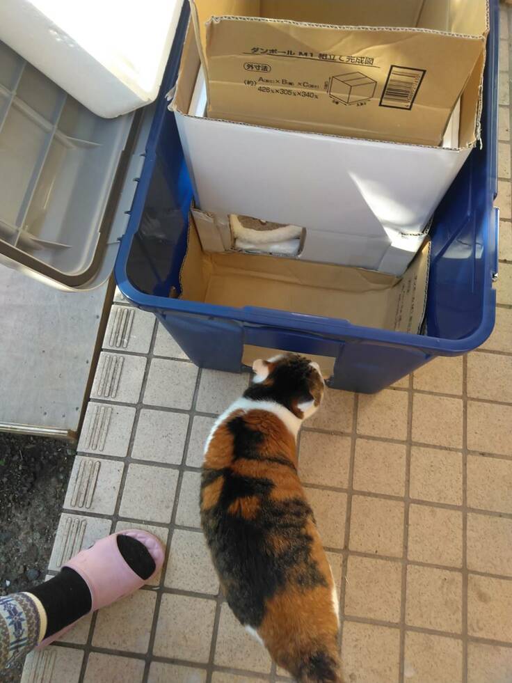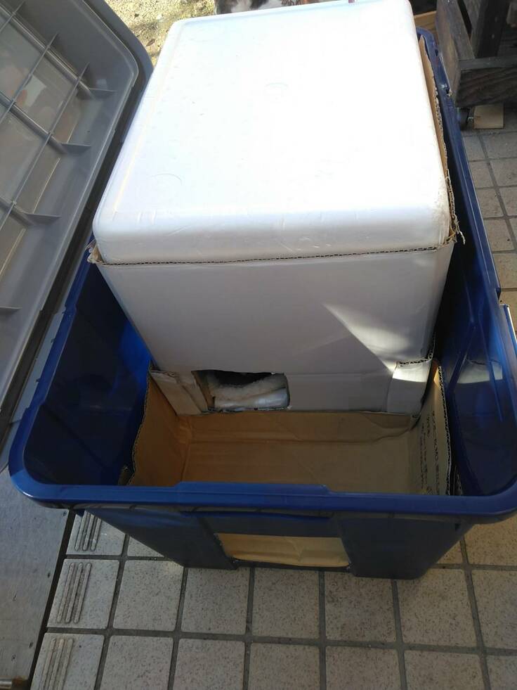 このように、隙間で暖を取る猫のために、とりあえず、足尾の厳しい冬で暖をとる小屋を作成させていただきました。