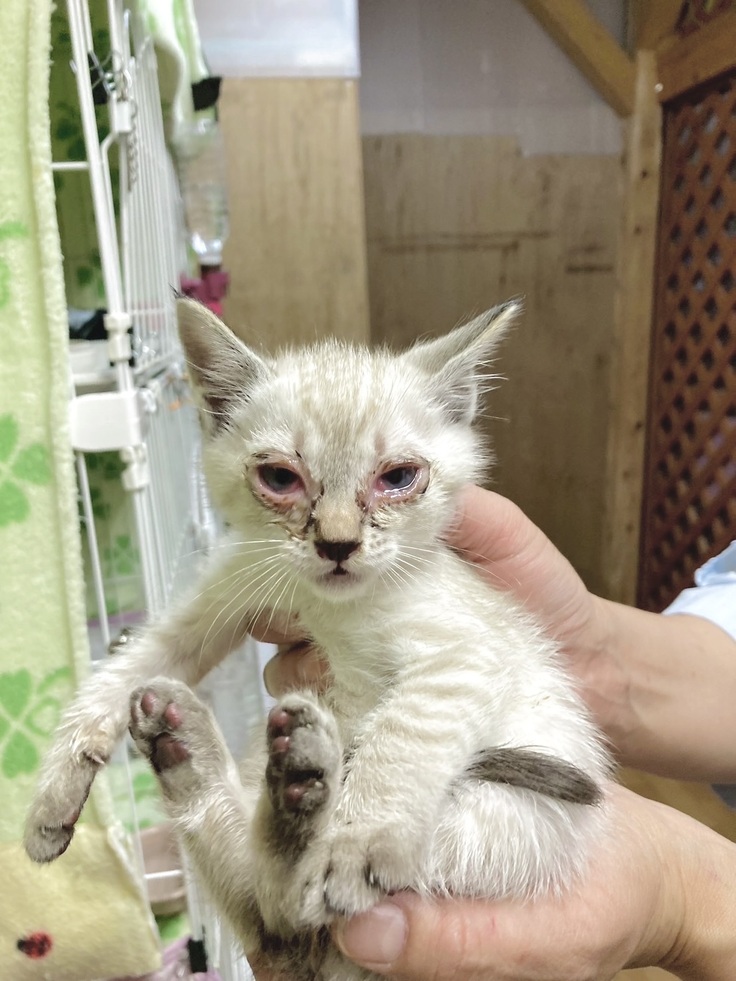 保護時は目は腫れ、鼻は詰まり、食欲もなく、あまり動きませんでした。