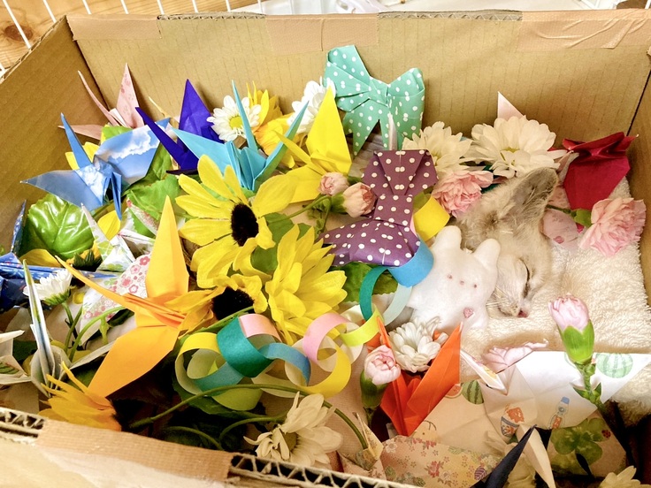 翌日スタッフ達の想いの折り鶴やお花に囲まれて、すいか君は虹🌈の橋を渡りました。