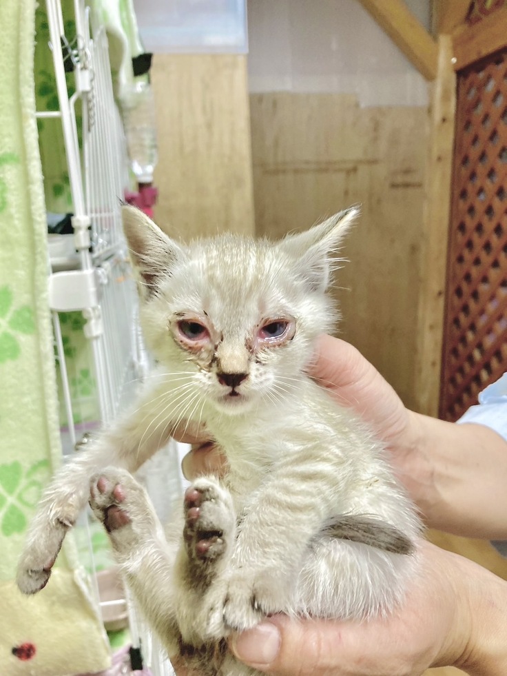 お迎えに行くと猫風邪で両目が真っ赤で目やにも酷い状態。