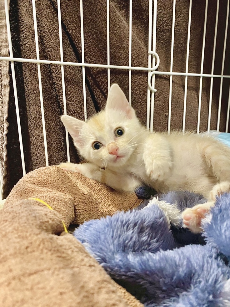 同じ時期に、他から保護された仔猫のお友達が『遊ぼうよ!』と近づいては周りを元気に走りまわります。うまく動けない、目が見えないけど、少しの間だけ楽しかったかな?